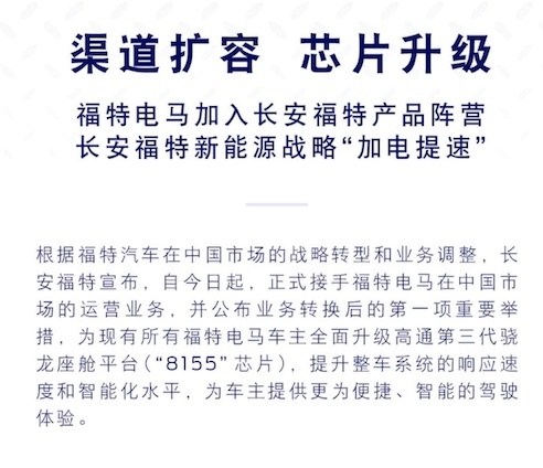 据先容,在适应接办福特电马运交易务的同期,长安福特还公布了业务调理后的第一项弥留举措——为现存统共福特电马车主全面升级高通第三代骁龙座舱平台(“8155”芯片),以此来擢升整车系统的反映速率和智能化水平。