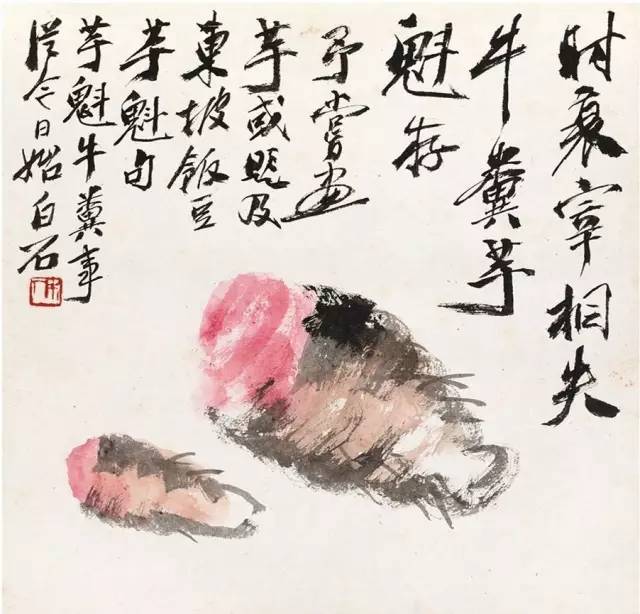 (九)时衰宰相失,牛粪芋魁存。予尝画芋,或题及东坡饭豆芋魁句。芋魁牛粪事从今始。白石。