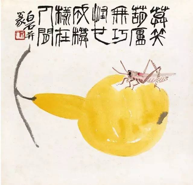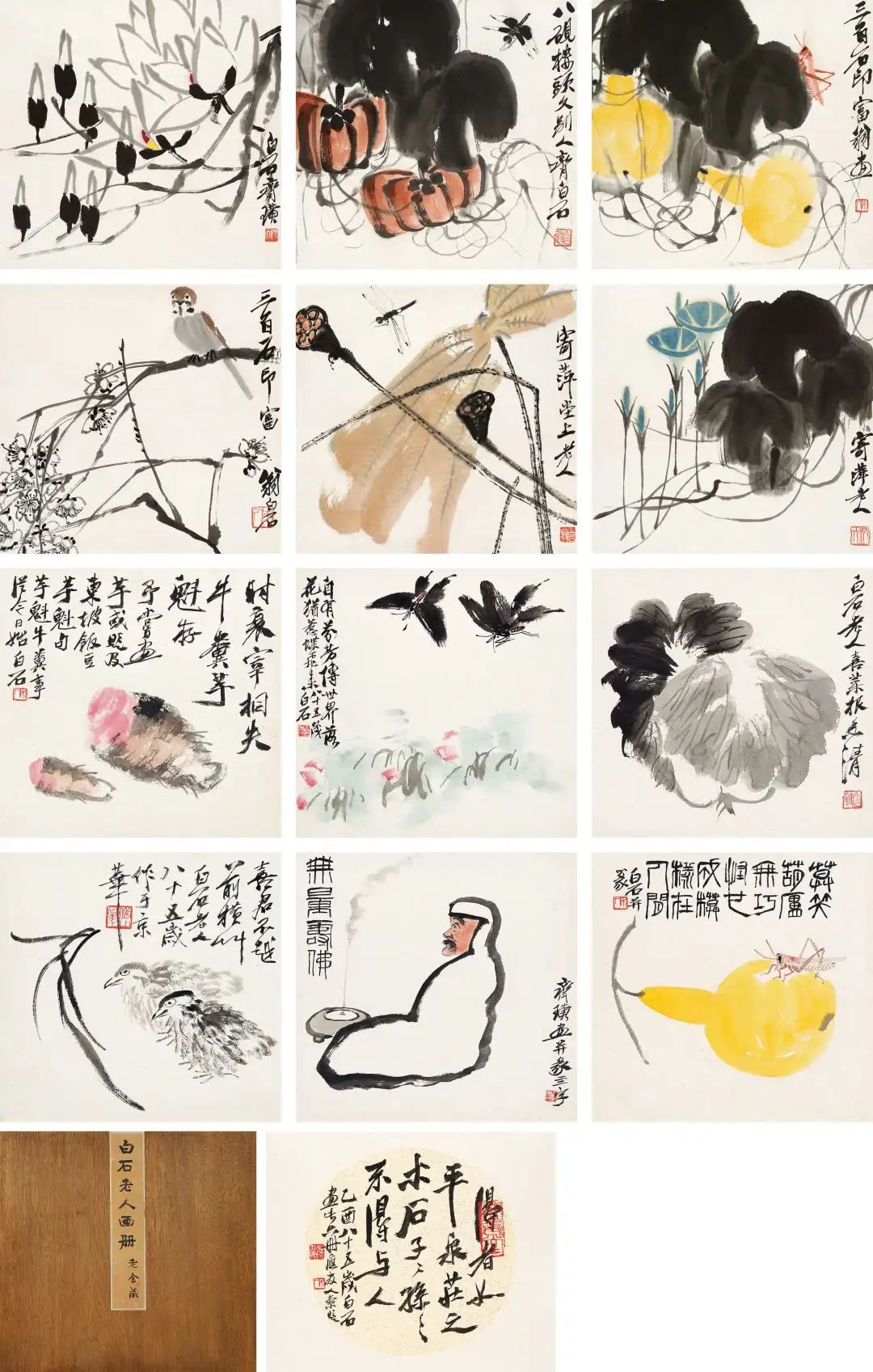老舍旧藏皆白石《花虫东说念主物册》,十二开,设色纸本,在中国嘉德2023春拍中以东说念主民币5520万元成交。此册页为皆白石85岁艺术繁盛期所作,涵盖多种题材,花草搭配草虫、葫芦、南瓜等等。